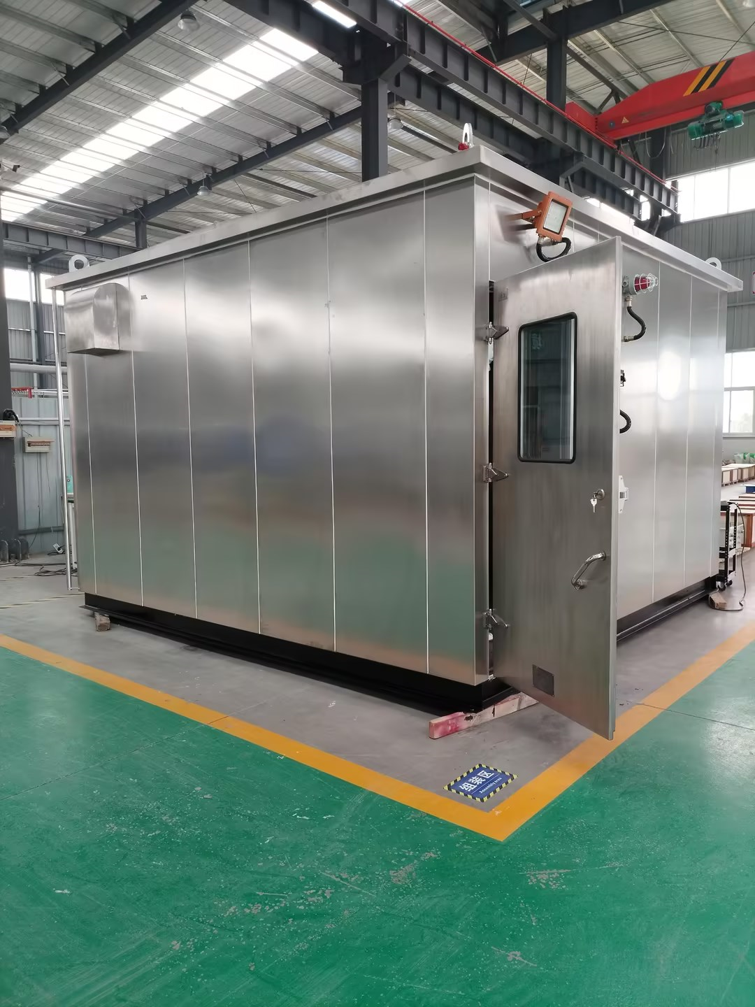 防爆分析小屋采用全鋼鐵式框架結構,將分析儀表、控制單元組裝在小屋內,樣品預處理及載氣、標準氣、驅動氣安裝在小屋外圍。取樣探頭及前級減壓站就近安裝在工藝管線旁。分析小屋內安裝有防爆空調,防爆電熱汀或蒸汽供暖設備(可選),可調節室內溫度。防爆配電系統為管線系統,配有防爆配電箱、防爆接線箱等電氣。防爆照明系統采用防爆熒光燈并帶防爆應急熒光燈。正壓小屋內還配 備有通風、換氣、過濾裝置,可定時通風換氣,保持室內空氣新鮮。防爆小屋內還配備有報警連鎖盤(含氣體傳感器及控制器)及聲光報警燈, 當有可燃/有毒氣體泄漏時,聲光報警燈會發出報警,以保護人身安全。